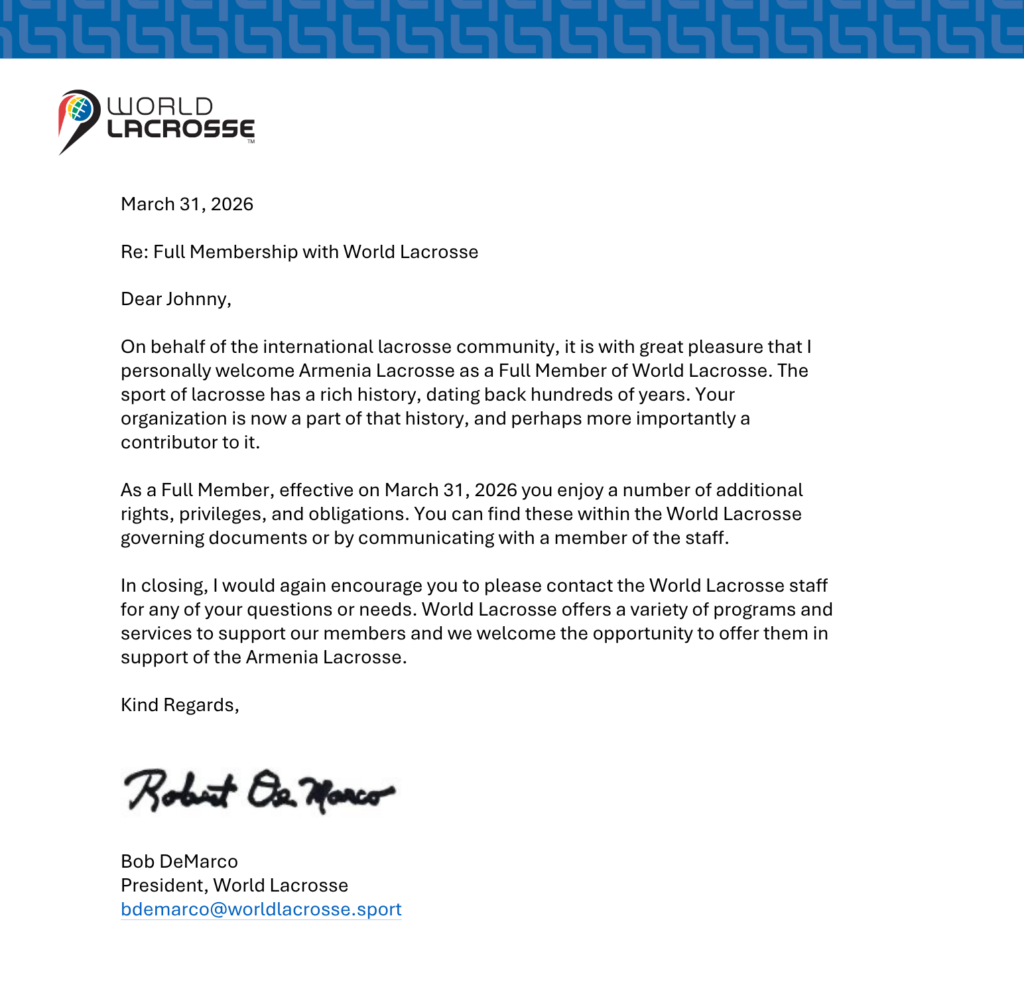 We are thrilled to announce that Armenia Lacrosse has officially joined World Lacrosse as its 93rd member! This marks a significant milestone for the Armenian sports community, opening doors for girls and boys, men, and women lacrosse players to compete in Armenia and on the international stage.